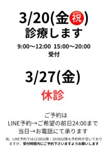 また、3/27金曜日は休診とさせていただきますのでご理解の程よろしくお願いいたします。